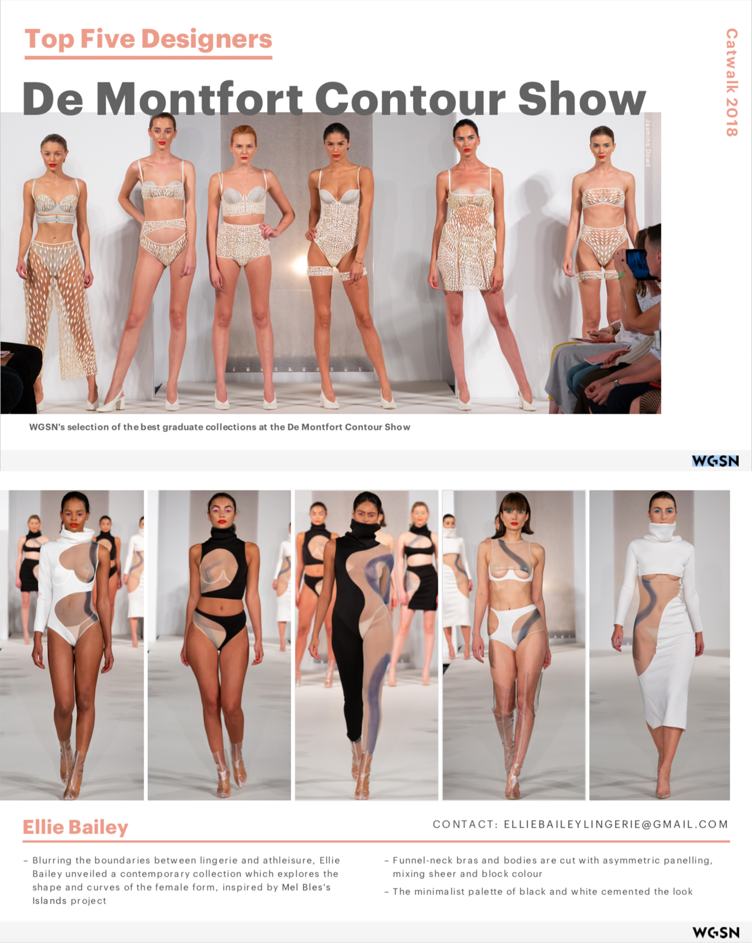 "Blurring the boudaries between lingerie and athleisure, Ellie Bailey unveiled a contemporary collection which explores the shape and curves of the female form, inspired by Mel Bles's Islands project." WGSN