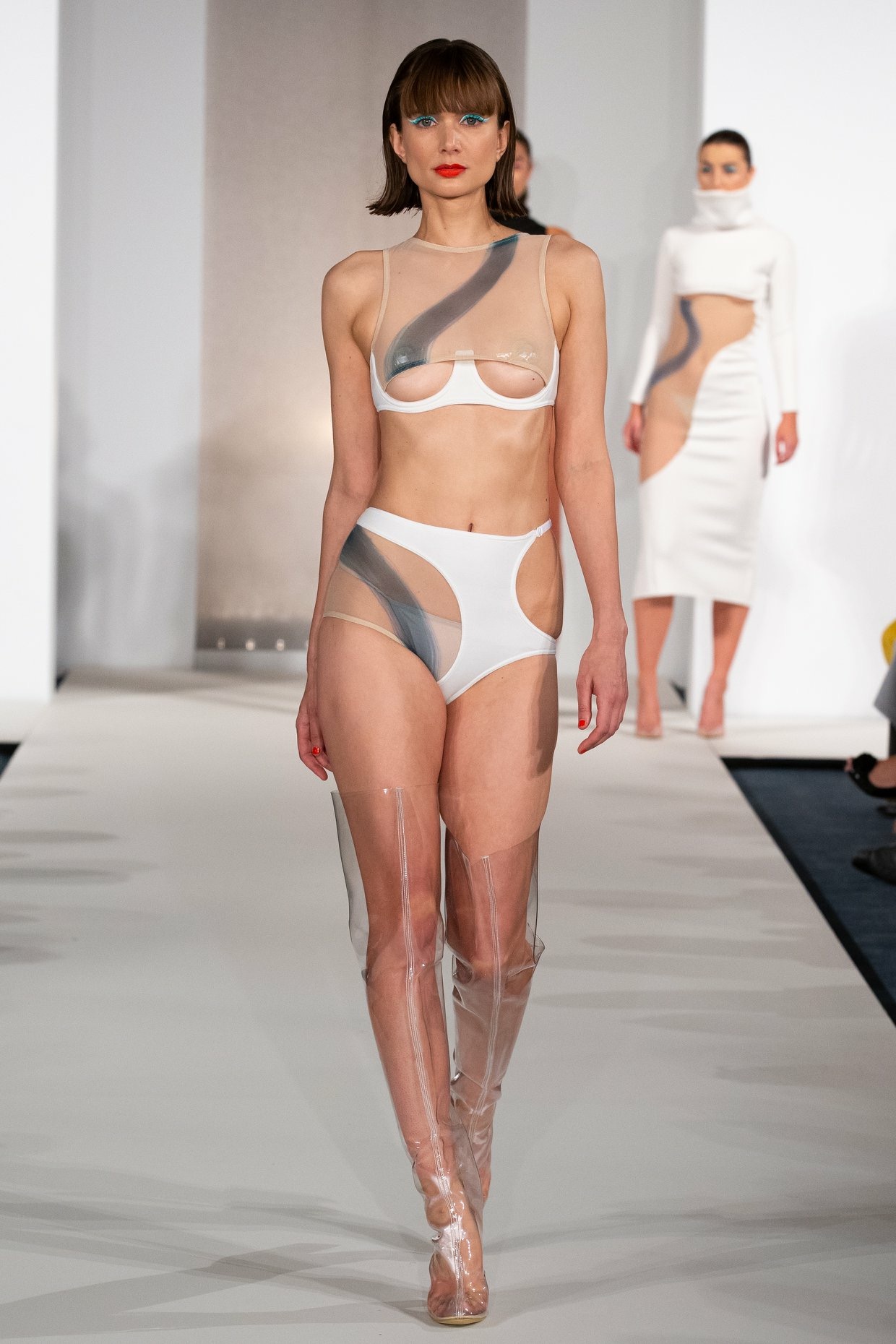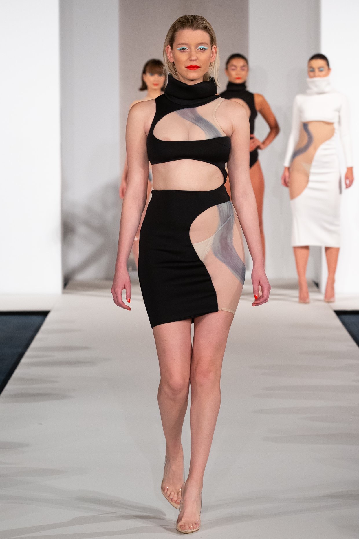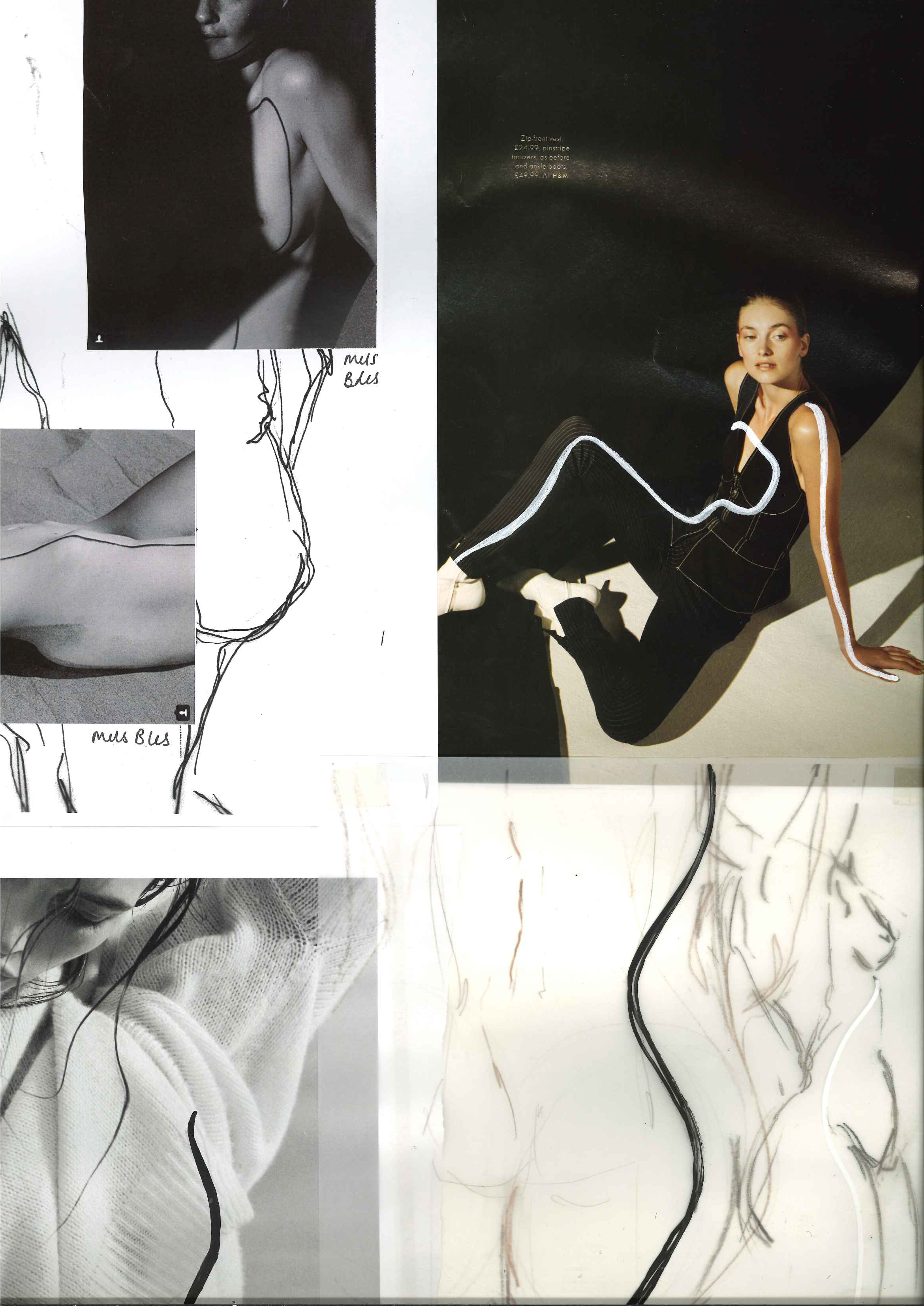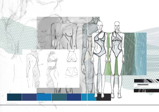 Inspired by "Islands", a photography series by Mel Bles, this project explores the shapes and curves of the female form. Starting by illustrating women in a number of life drawing classes, mark making in different mediums inspired the smooth curves found throughout the collection. Developing designs and experimenting with fabric led to a semi sheer collection which pushes the boundaries of female nudity in a vunerable yet empowering way.