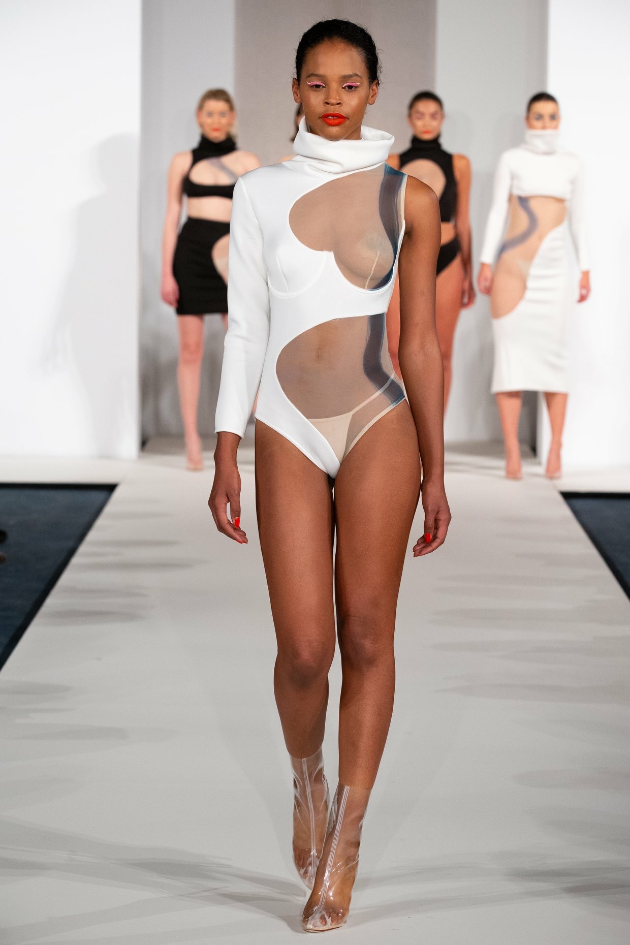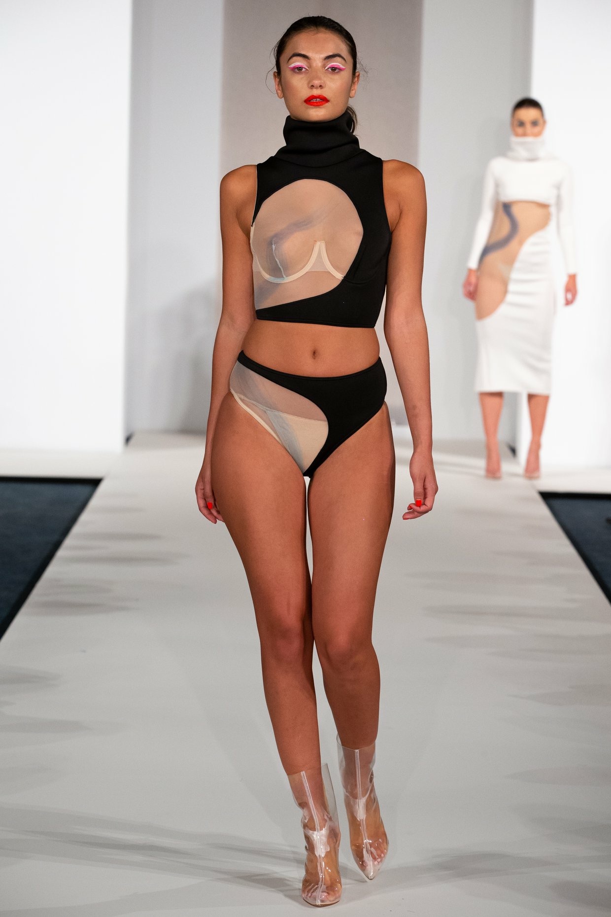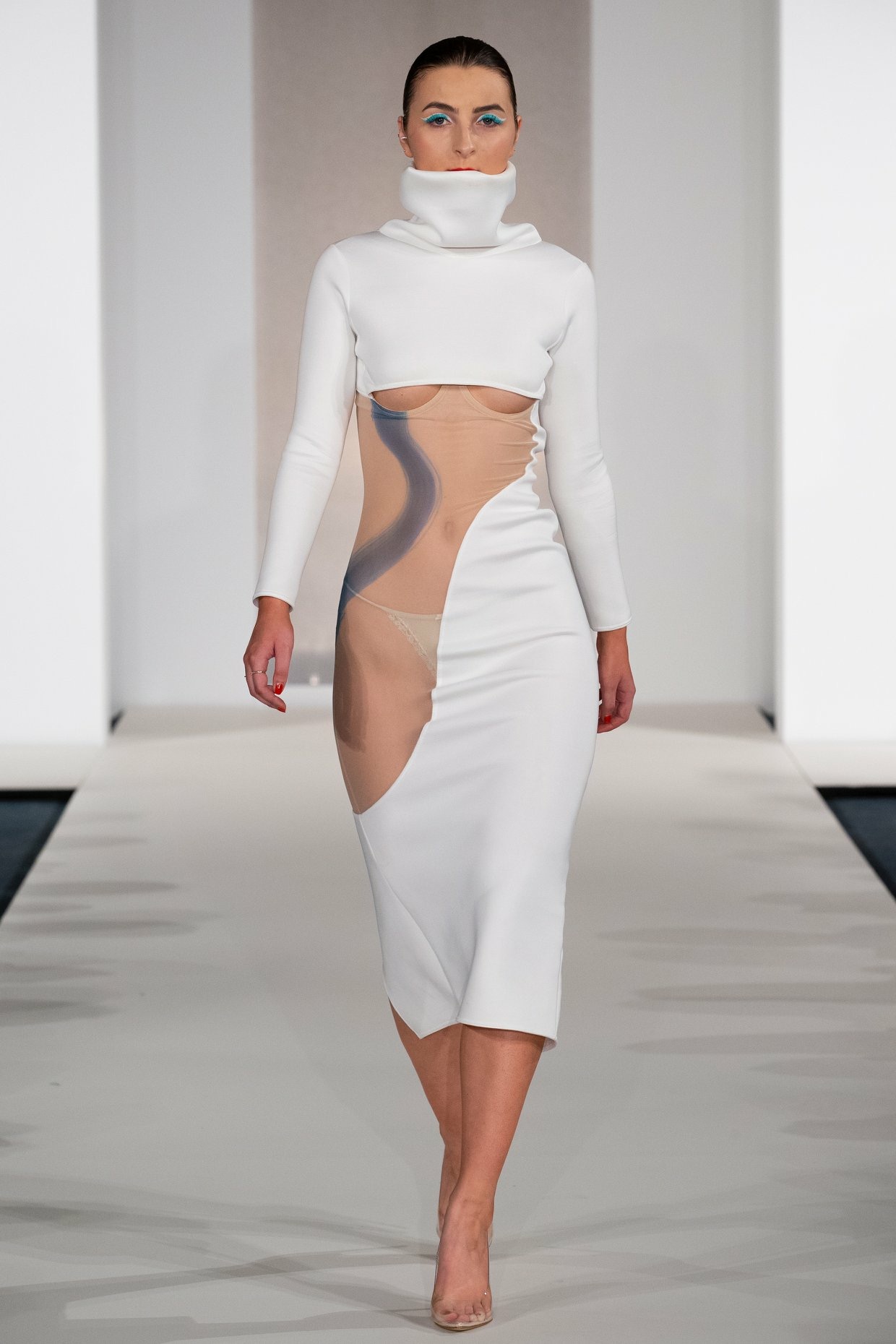Inspired by "Islands", a photography series by Mel Bles, this project explores the shapes and curves of the female form. Starting by illustrating women in a number of life drawing classes, mark making in different mediums inspired the smooth curves found throughout the collection. Developing designs and experimenting with fabric led to a semi sheer collection which pushes the boundaries of female nudity in a vunerable yet empowering way.